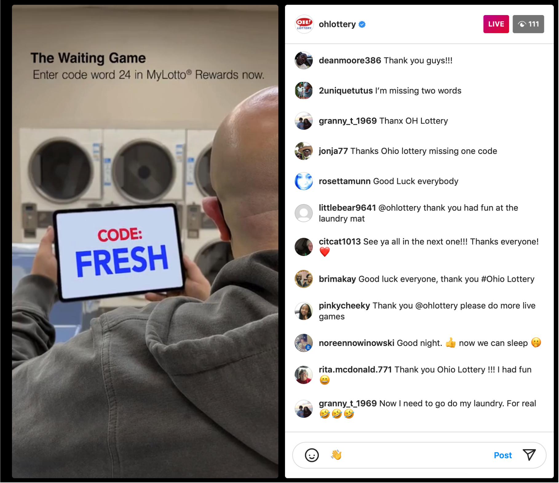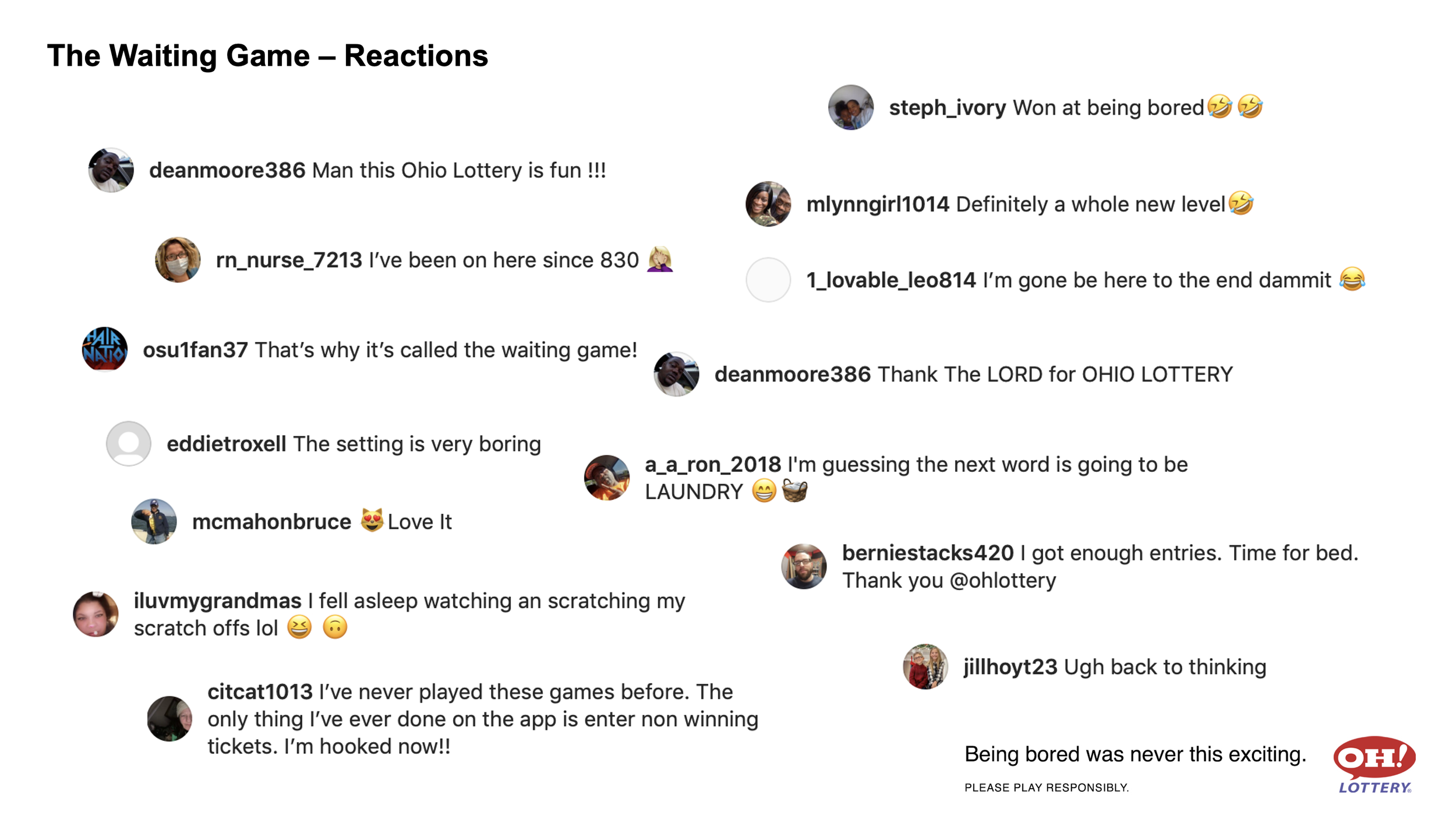 For years, The Ohio Lottery has been making everyday moments fun. Even the boring ones. The Waiting Game took a quintessential experience - passing the time on social media - and made it playable. We hacked Instagram Live for 24-hours, inviting people to be bored with us to earn entries into prize drawings while promoting $20 Scratch-Offs. Results included 41K total entries, a 20% increase in followers, people skipping work and sacrificing sleep to be bored with us, and a hand in driving a $5 million increase in $20 Scratch-Off ticket sales.